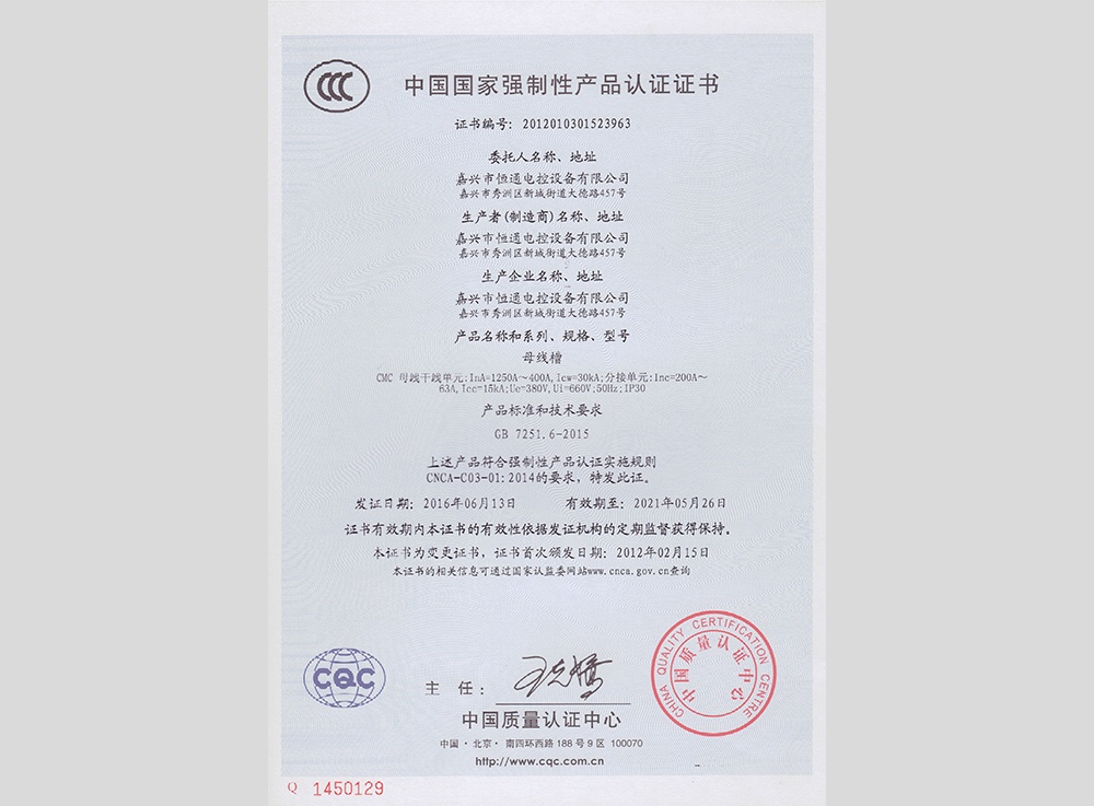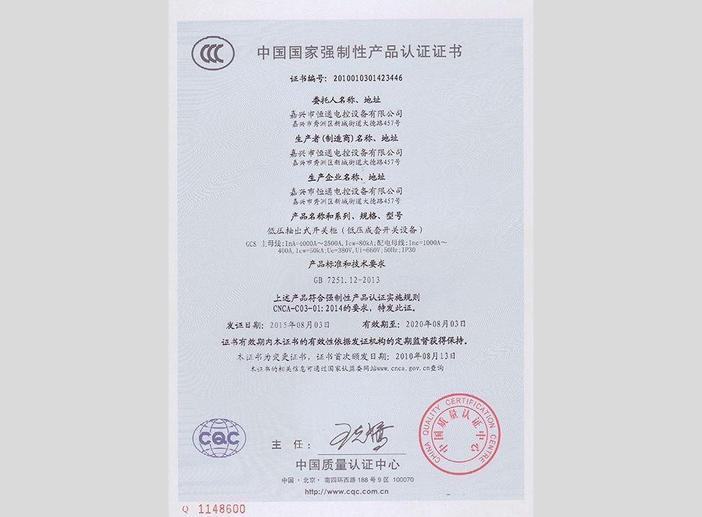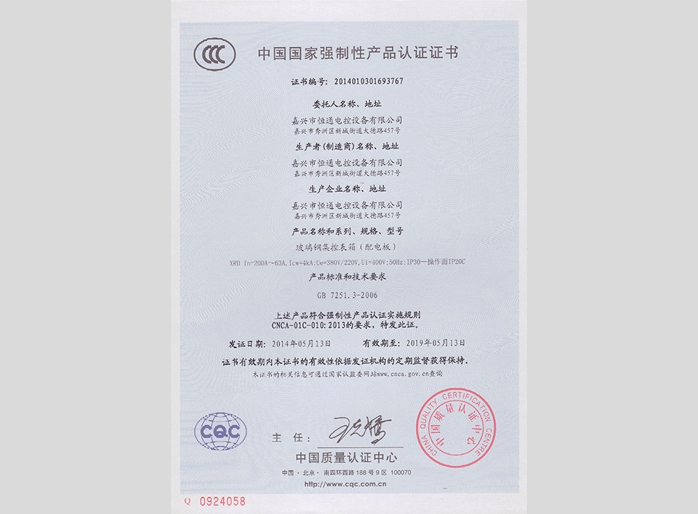 認領(lǐng)"3C"證書(shū)及型式試驗報告,產(chǎn)品分別有:高低壓 箱式變電站XBW、高壓中置柜KYN28、抽出式低壓 成套配電柜MNS、低壓抽出式開(kāi)關(guān)柜GCS、低壓配 電柜GGD、電容補償柜GGJ、母線(xiàn)槽CMC、集控表 箱XRC、玻璃鋼集控表箱XRD、低壓動(dòng)力柜XGL、電 纜分支箱HWF、低壓配電箱XRL、模數化照明箱PZ30。